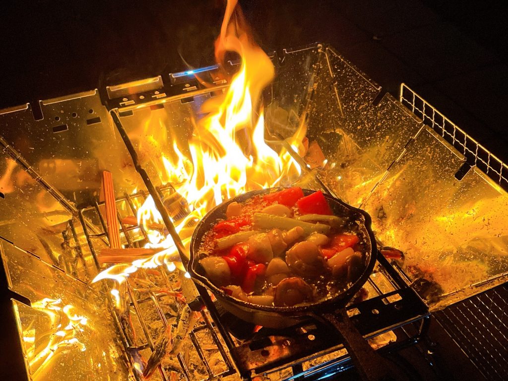 下の写真はキャンプで初めて作った料理になるアヒージョです!