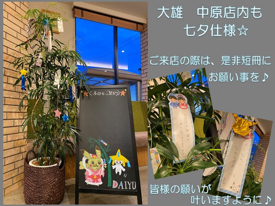 ご来店の際は是非、短冊にお願い事を書いて入口付近にある観葉植物(笹に葉っぱが似てます!(笑))に飾ってください☆