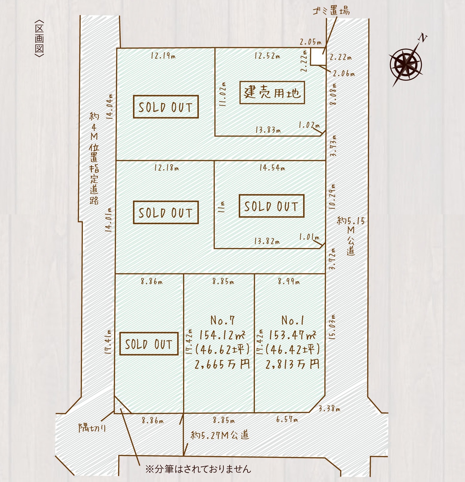| 備考・制限等 | ※図面と現況が異なる場合は現況優先とします ※No1.2.6敷地内に電柱有 ※電線の移設は令和8年2月末予定 ※西側の位置指定道路は持分が無い為使用できません。 ※クリーンステーション4.51㎡(1/7) |