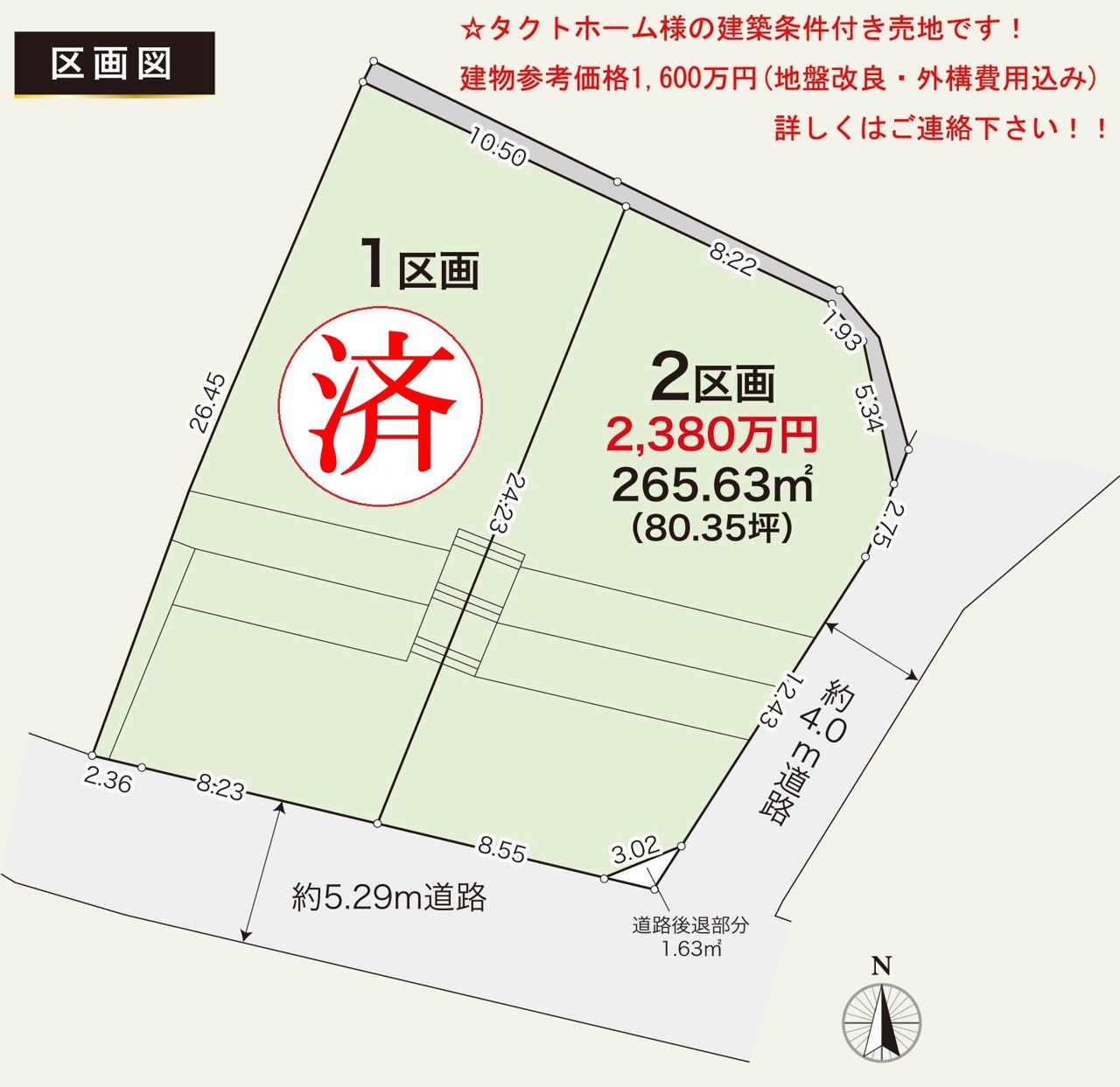 | 備考・制限等 | ※建築条件付売地(建築条件付き土地とは、土地売買契約締結後3ヶ月以内に売主または売主の指定するものと建物建築工事請負契約結んで頂きます。但し、双方の合意が成されず建物建築工事請負契約が成立しなかった場合は、土地売買契約は白紙となり、受領した金額は無利息にて金額お返しする契約です。) | ||