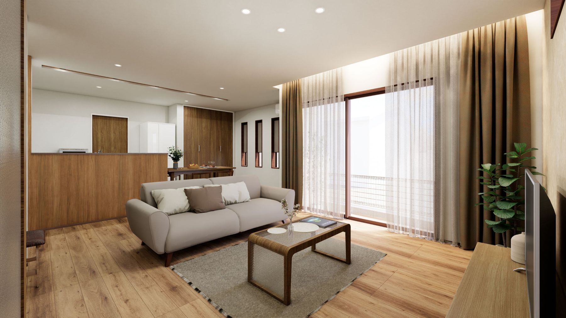 明るく開放感のあるLDKは南側の大きな窓から陽が差し込み、外からの視線を気にすることなく過ごせます。キッチンからはリビング全体を見渡すことができ、家族みんなの様子が見えます。南側には約100インチのスクリーンで映画館にいるような感覚を味わえます。ソファなどはあえて置かず好きな位置からテレビやホームシアターなどを楽しむことができます。
