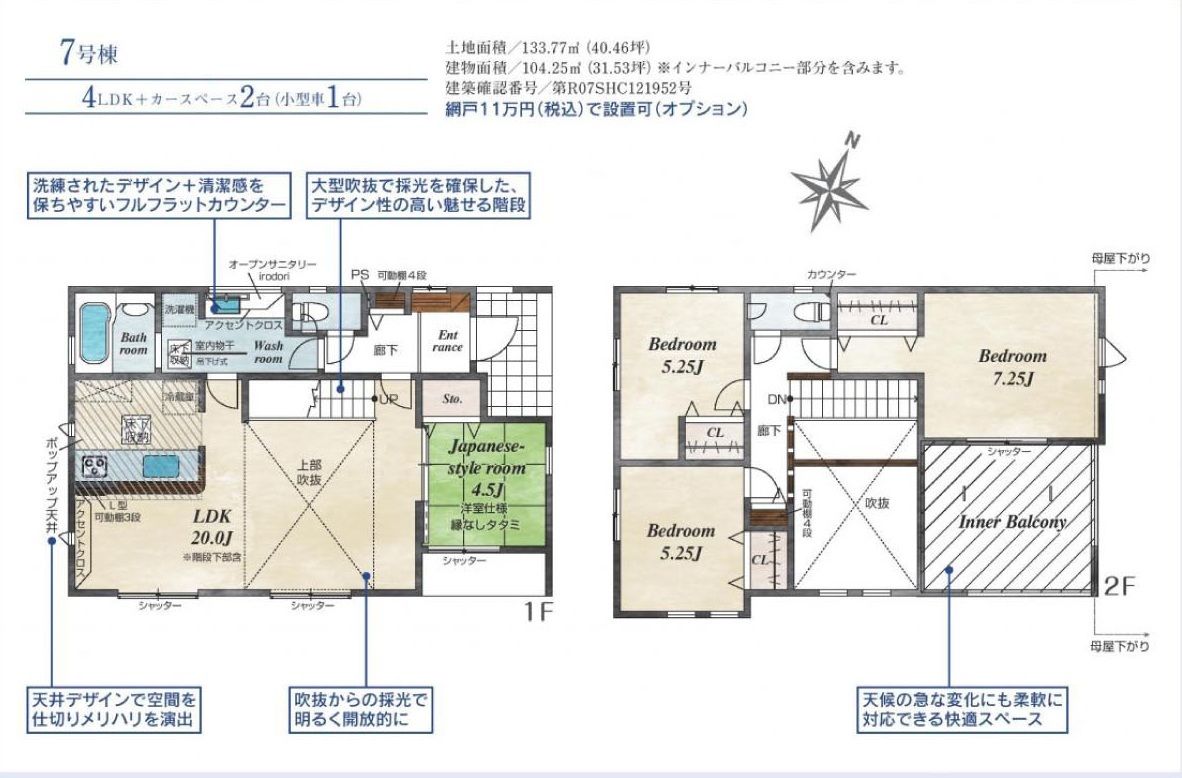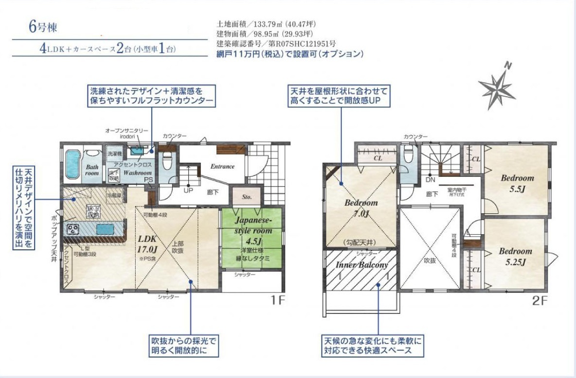 | 建物面積 | 98.54m² ~ 104.25m² (※7号棟 インナーバルコニー込み) | ||