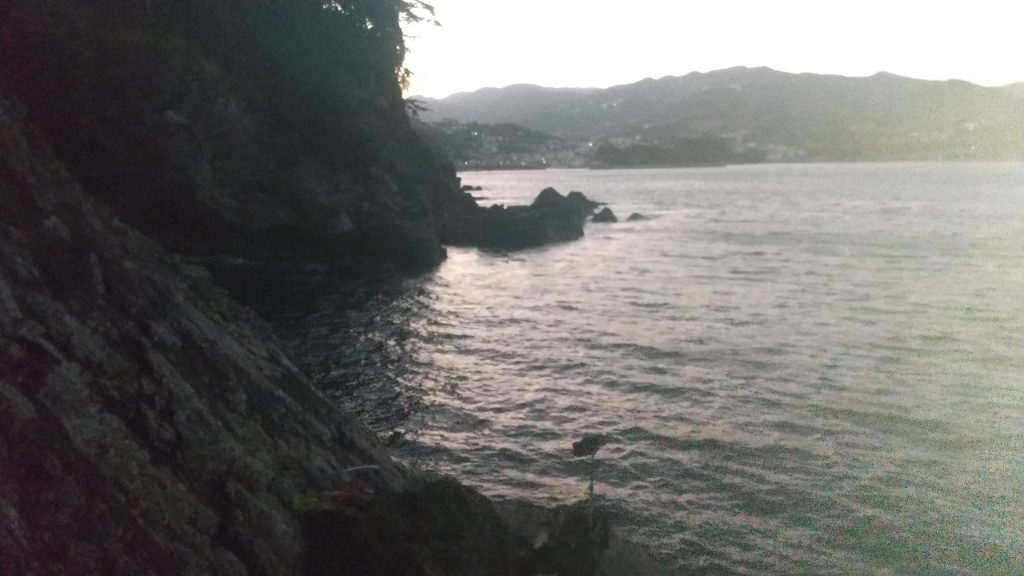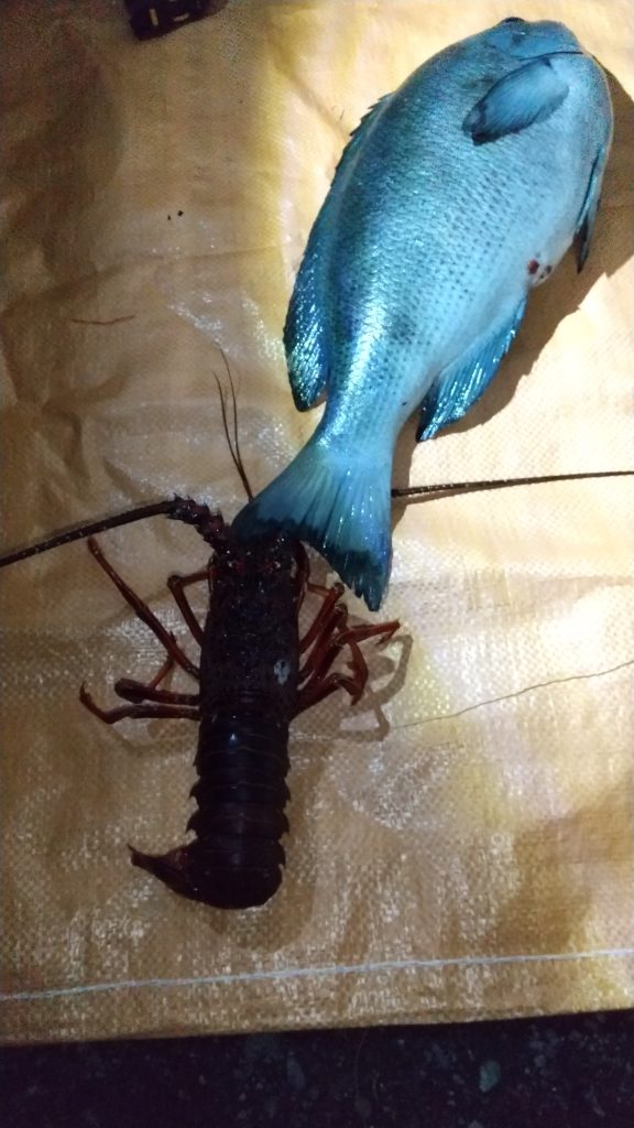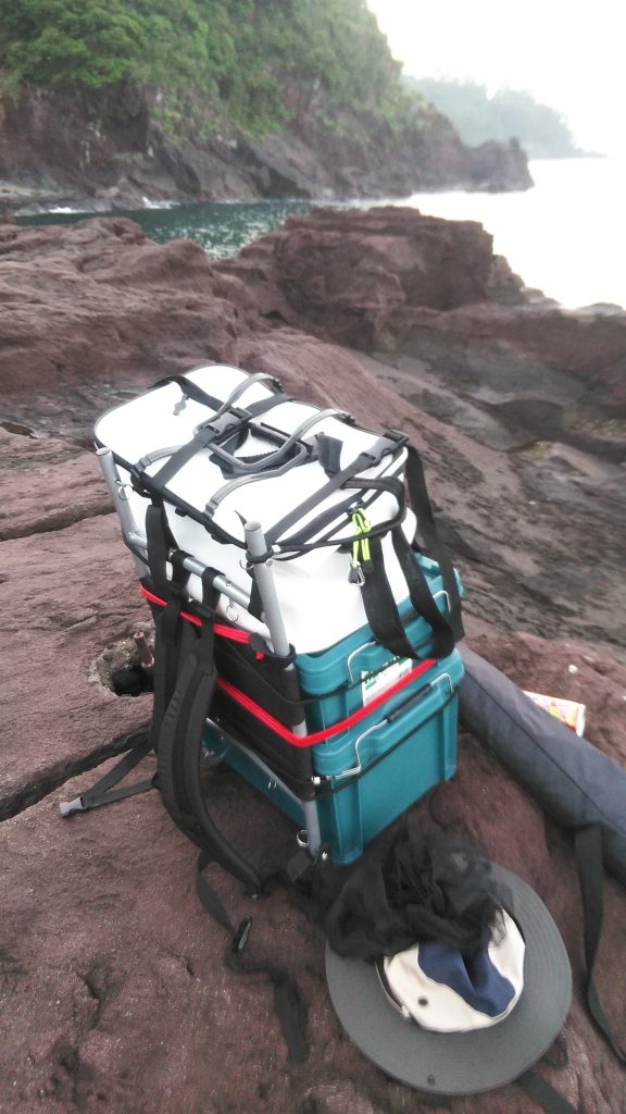船釣りと違い磯釣りでは険しい道を釣り竿、道具、撒き餌を背負って下りていきます。