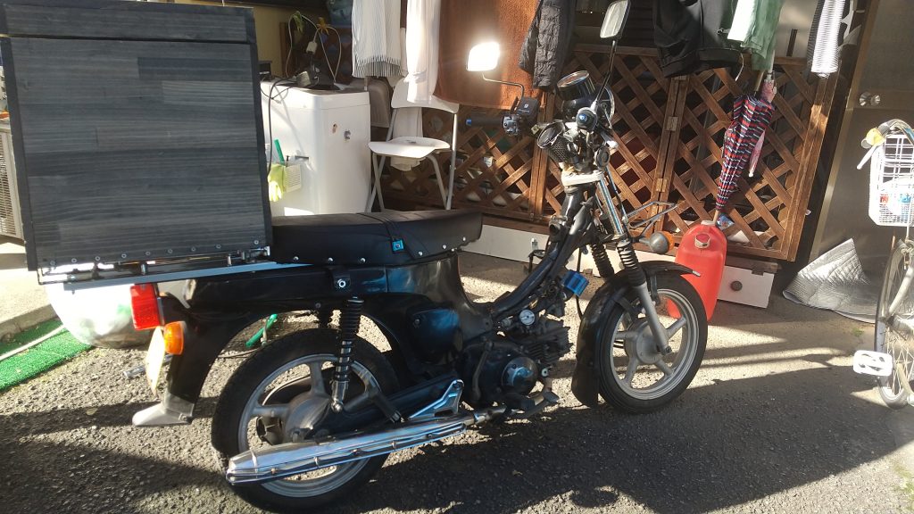 釣りに行くと駐車場の問題もありますのでバイクを購入、後ろに大きな箱を自作で