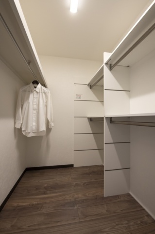 広々WICは押込収納で小物も仕分けでき、階段で上れる小屋裏収納等、使い勝手のいい収納スペースもしっかり確保しました。