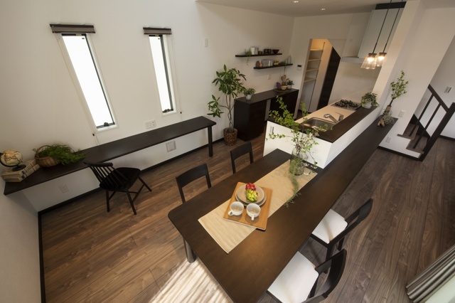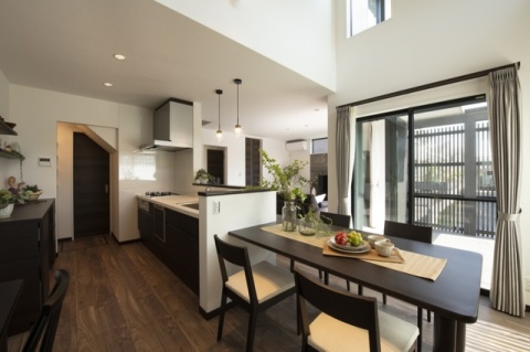フラットに繋がるデッキが心地いいリビングは、玄関との明暗差とダイニングの高天井+上部の開口により、シックで落ち着く色調でありながらも、明るく広々とした空間に。