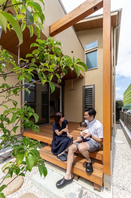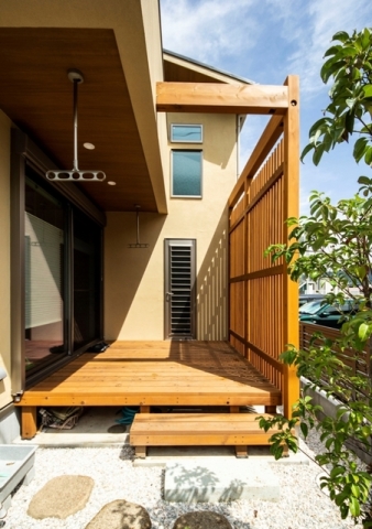 ウッドデッキ先の庭には、目隠しも兼ねたシンボルツリーと、お子様の誕生を祝う記念樹として十月桜を。共に成長を見守れますね。