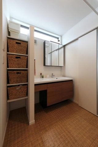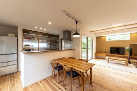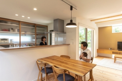 キッチンの背面は、奥様こだわりの造り付けの食器棚。半透明の扉で隠しつつも、窓から採光はしっかり確保しました。コンロ前の壁も開口し、目線は通しつつも手元は見せない高さに。見せる収納・隠す収納の絶妙なスタイルです。