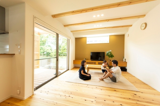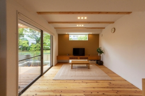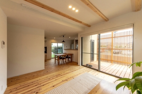 無垢材に囲まれたリビングは、大きな窓でフラットにウッドデッキと繋がり、周辺の緑を借景しつつ、格子でゆるやかに視線を遮る心地良い空間。