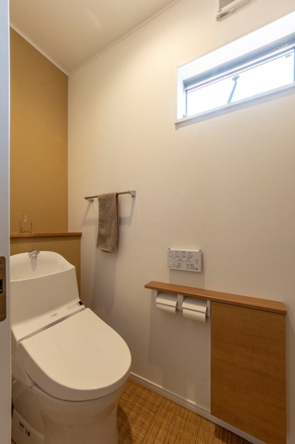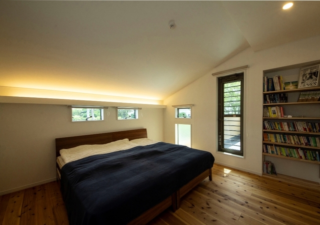 HOME注文・企画住宅自然を取り込むシンプ... 注文・企画住宅 2023年4月29日 自然を取り込むシンプル和スタイルの家 ■エリア:小田原市 T様邸 ■工法・構造:木造軸組工法 建築ポイント ゆったりと落ち着いた街並みに馴染む和モダンスタイルのT様邸。 無垢材に囲まれたリビングは、大きな窓でフラットにウッドデッキと繋がり、周辺の緑を借景しつつ、格子でゆるやかに視線を遮る心地良い空間。 造作のテレビ台で空間の調和と、高い天井により空間の広がりを感じられます。 ウッドデッキ先の庭には、目隠しも兼ねたシンボルツリーと、お子様の誕生を祝う記念樹として十月桜を。共に成長を見守れますね。 玄関横の雨のかからない駐輪スペースには、格子を設けて外観に統一感を。 ご主人の趣味のアウトドアグッズの一時的な置き場としても便利です。 キッチンの背面は、奥様こだわりの造り付けの食器棚。半透明の扉で隠しつつも、窓から採光はしっかり確保しました。コンロ前の壁も開口し、目線は通しつつも手元は見せない高さに。見せる収納・隠す収納の絶妙なスタイルです。 主寝室は、間接照明でホテルライクな落ち着いた空間を演出。約5帖もの広々WICへと続き、寝室はいつもすっきり綺麗な状態を保てます。 2F廊下には一面に書籍が並ぶ、ご主人こだわりの家族共有ライブラリー空間。 扉の上には明り窓を設け、家の中心にあっても暗くならない工夫を。 明りの採り方、地域の風向きに合わせた窓計画。複数の回遊動線。 暮らしに寄り添うこだわりが散りばめられた、パッシブデザインハウスです。