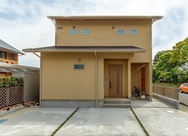 玄関横の雨のかからない駐輪スペースには、格子を設けて外観に統一感を。