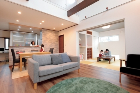 リビングと和室を大開口引き戸で間仕切り、開閉によって空間を自由自在に演出できます。