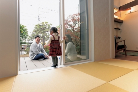 ウッドデッキ~和室~リビングと、お子さんも元気に走り回れるスペースです。