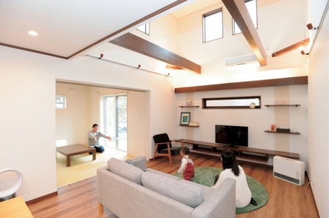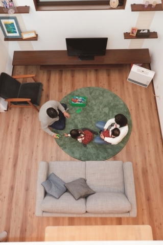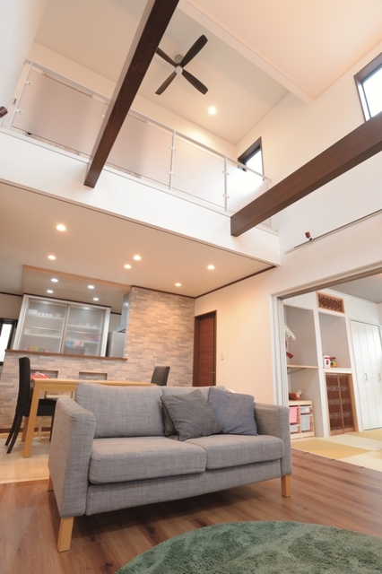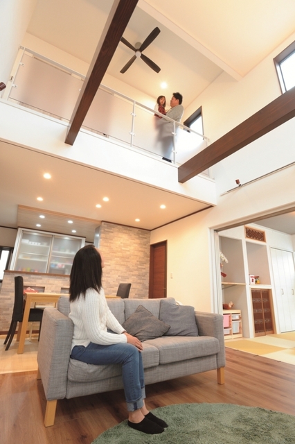 リビングと2階をつなぐ大きな吹抜けが目を惹くO様邸。