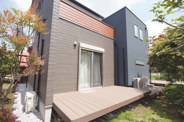 建物南側には広々としたウッドデッキ。豊かな植栽に囲まれて、季節の移ろいを感じられます。