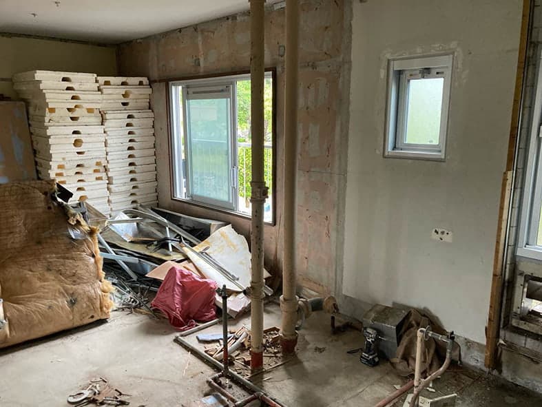 床下地のきしみ、配管の劣化等、建物内部は決して良い状況ではありませんでした。スケルトン解体することで床下の見えない配管類を交換、共用部本管から新規引込をしたので安心して暮らせます。