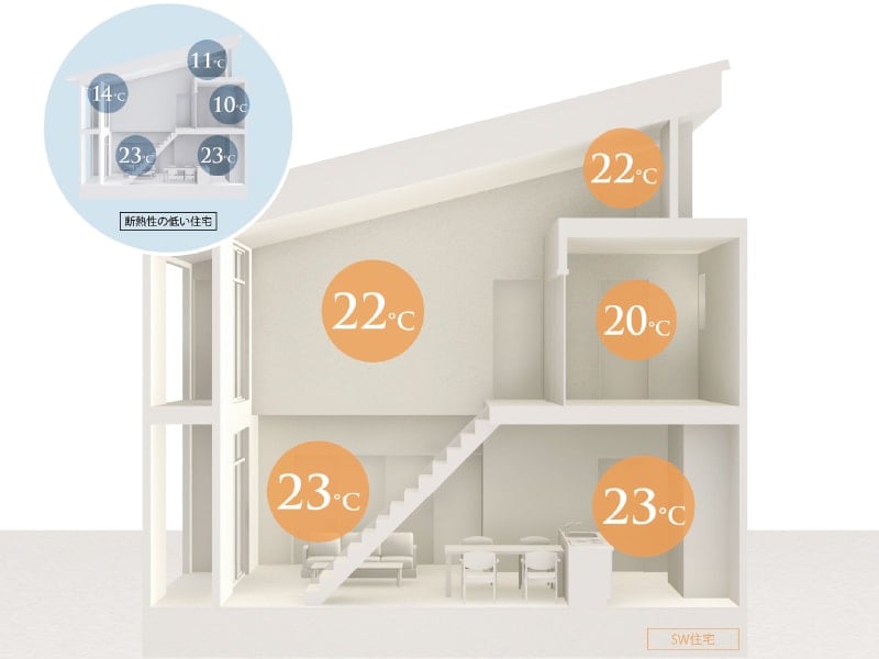 高い断熱性と気密性は、エアコンなどで暖めた家の中の熱を外に逃がさないので、冷暖房をしている部屋だけでなく、廊下やトイレまでほぼ同じ温度にしてくれます。温度変化のない室内環境は快適なだけではなく、健康にもよい効果があります。