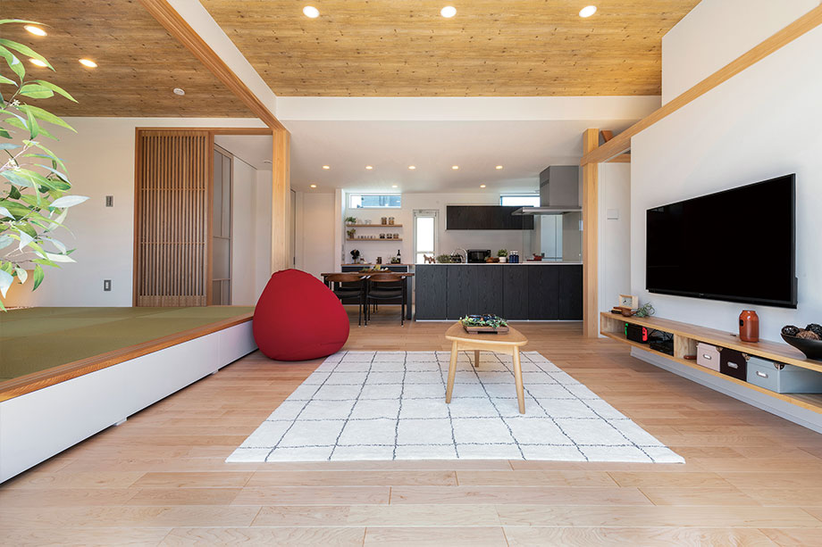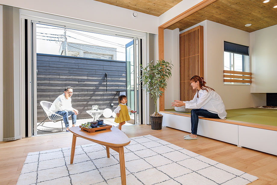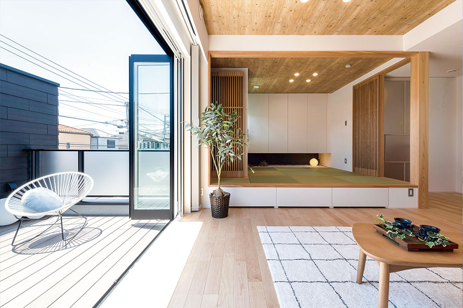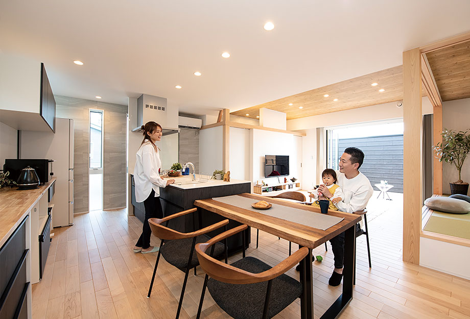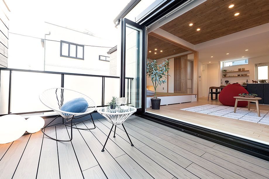 外からの目線が気にならない2階リビングは、家の中にいながら外とシームレスに繋がる、心地よい空間。