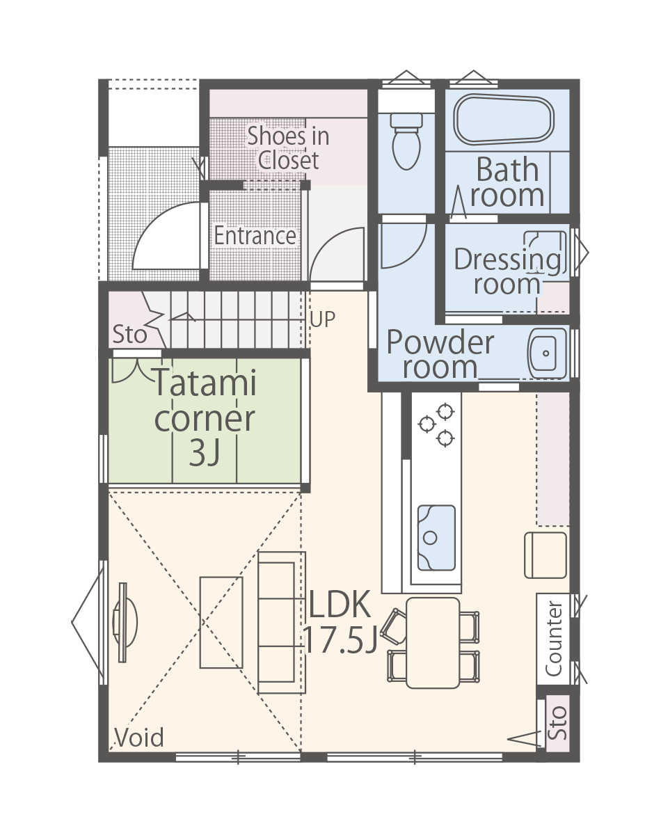 北側にゆとりある駐車スペース2台+α(自転車や車種によっては3台目)を確保。 LDKはタタミコーナーと合わせて20帖の広々空間。6帖の吹抜けで南側のお庭が狭くても明るさと解放感が抜群。 キッチンから水回りへ抜ける家事動線、雨の日や日差しの強い日でも安心のゆとりある玄関前のスペースなど、生活のしやすさと遊びごごろを兼ね備えたプラン。
