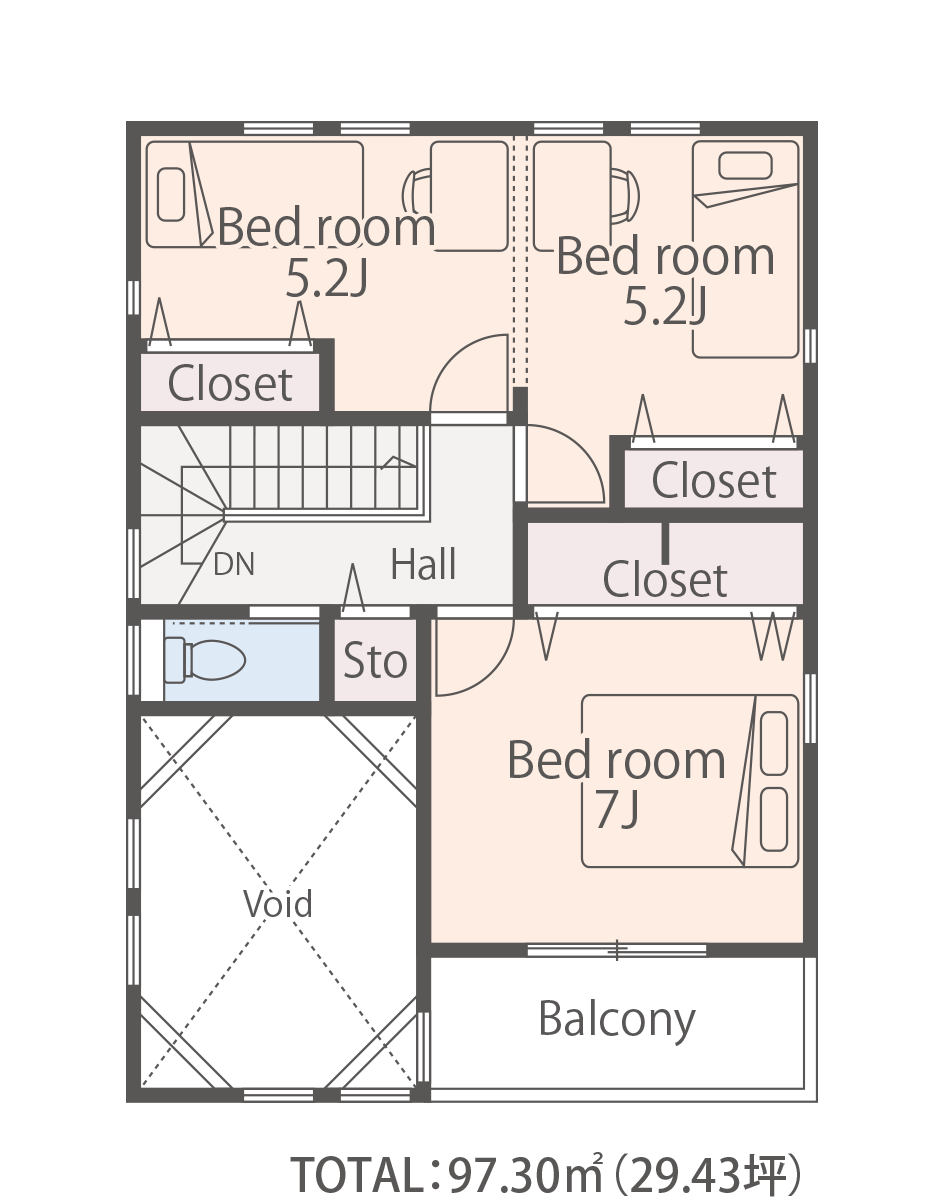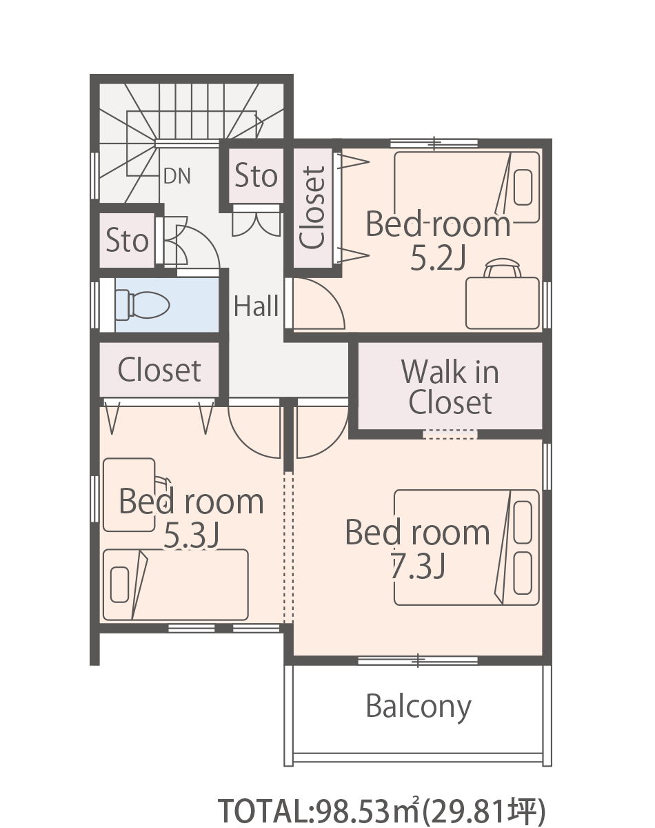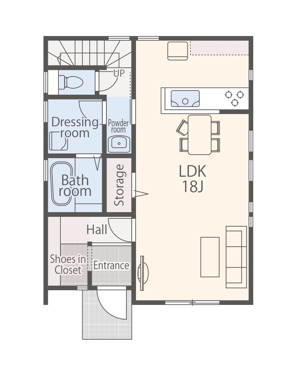 ダイニングテーブルと3人掛けのソファを置いてもまだゆとりのある18帖のLDK。 初めから仕切るもよし、広々家族みんなの寝室にしても良しの2階のお部屋。 玄関横の収納や洗面・脱衣スペースの分離、LDKや廊下に掃除機など日用品の収納など様々な暮らしをお聞きしてきた中で必要なスペースをしっかり確保したプラン。