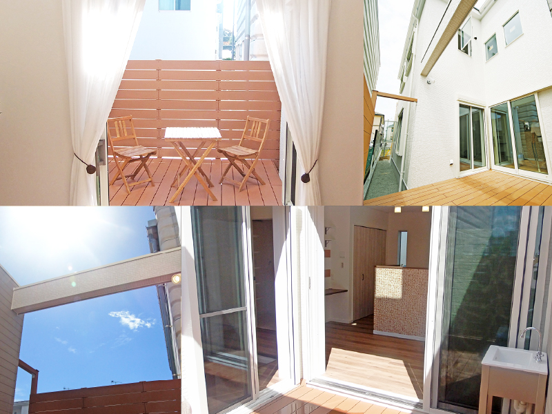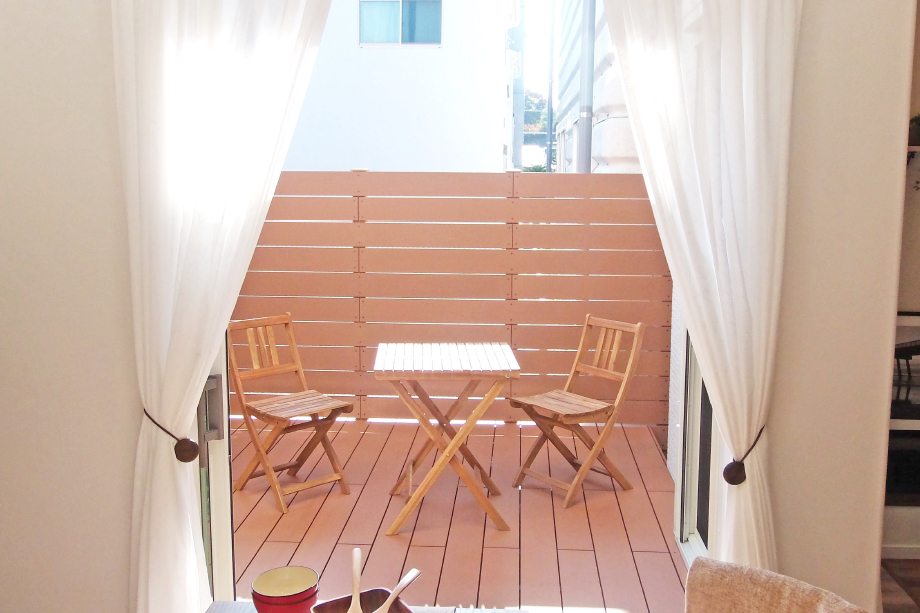 庭スペースはウッドデッキ仕様にしLDKに隣接させてプランニングし、テーブルセットをゆったり置けるアウトドアリビングに。