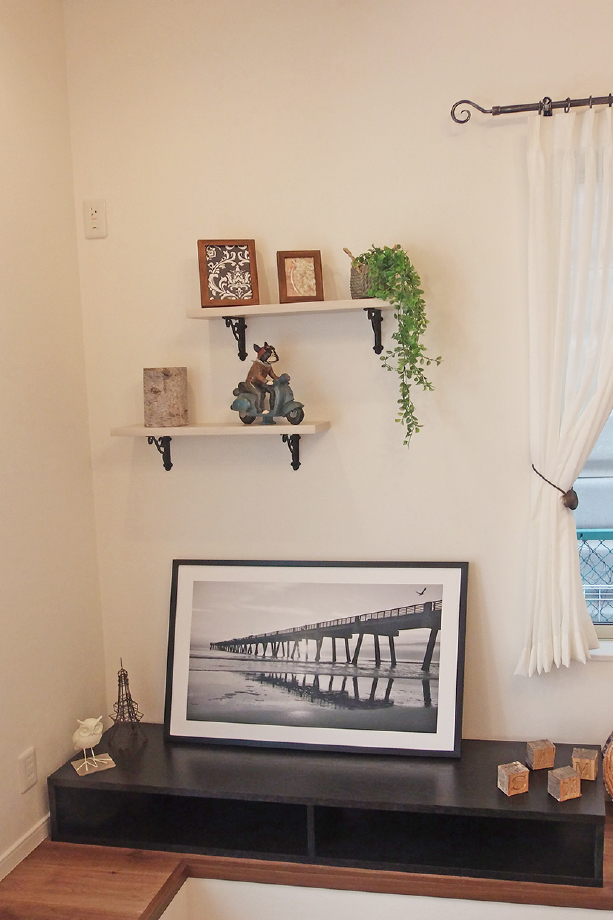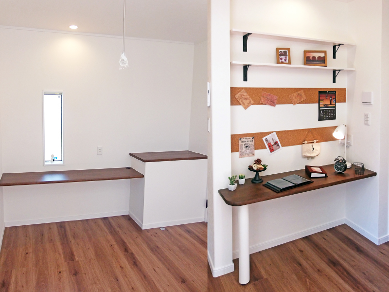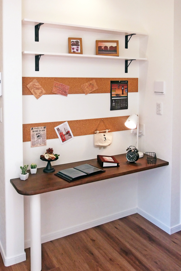 キッチン横のカウンターは家族のパソコンコーナーにしたりお子さんが宿題をしたりと、家族の気配を感じながらフレキシブルな使い方ができます。壁面にはコルクタイルを使用し、家族の写真を貼ったり、冷蔵庫に貼られがちな学校や幼稚園からのプリントを整理したり、インテリア性と実用性を両立させました。上部に設けた飾り棚がインテリアとしてのバランスも整えてくれます。