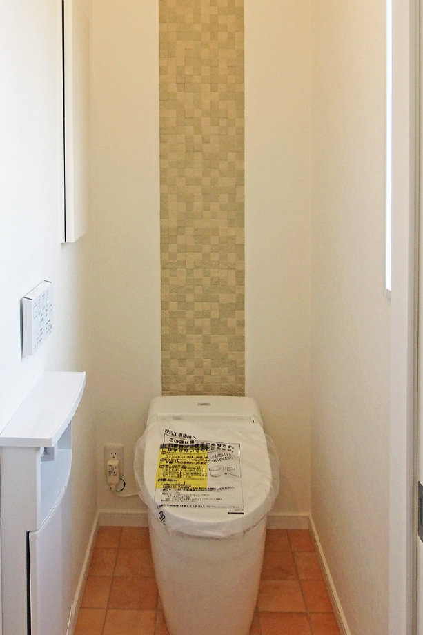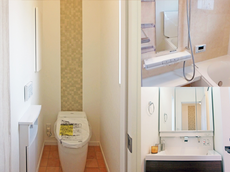 トイレは人気のタンクレストイレ+調湿・消臭機能もあるデザインタイルをアクセントに。洗面台はホコリがたまりにくい形状のシャワー水栓に三面鏡収納+フルスライド引出し収納のハイグレードモデル。
