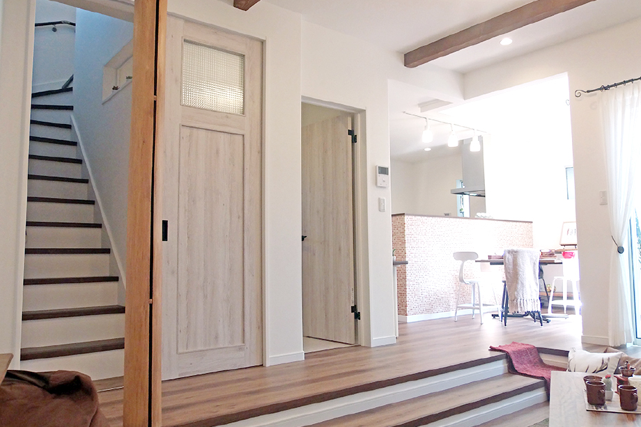 インテリアコーディネートは女性に人気のカフェテイストに。自然な木目に加え肌触りが気持ちいいハイグレードフロアをベースに、カラーペイントドア、白い壁とアンティークの装飾で落ち着きのある優しい空間に仕上げました。