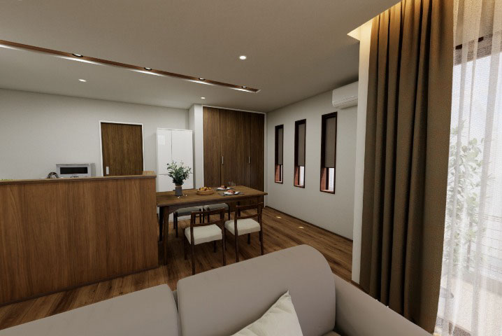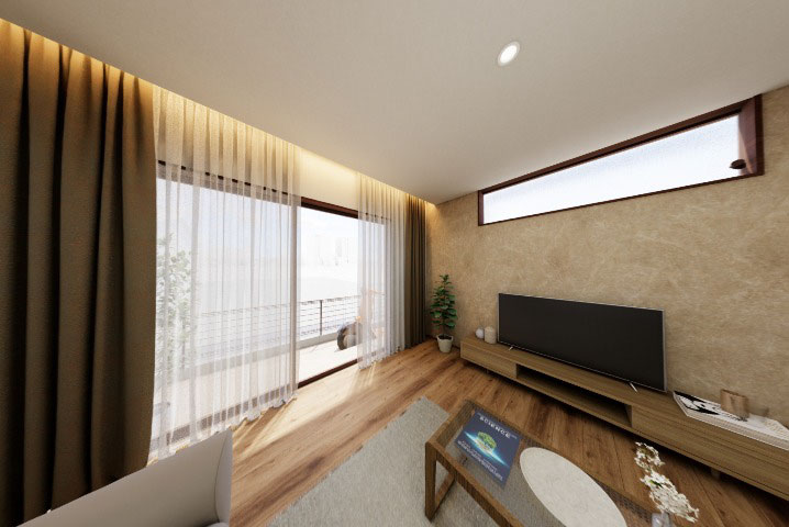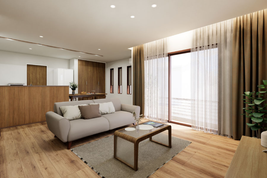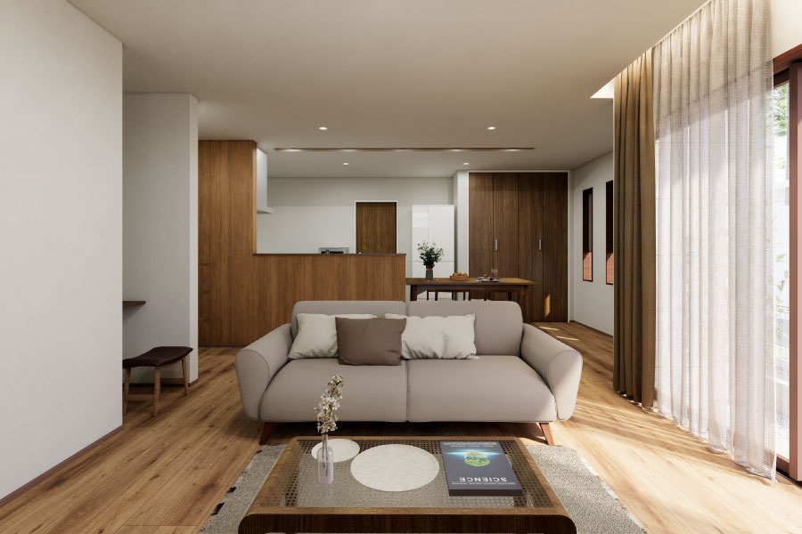 リビングは折り上げのカーテンBoxの間接照明、あえてレースのカーテンを内側にし、カーテン越しの柔らかな明かりが上質なリラックス空間を演出。