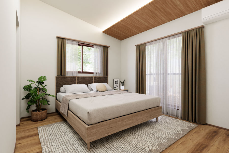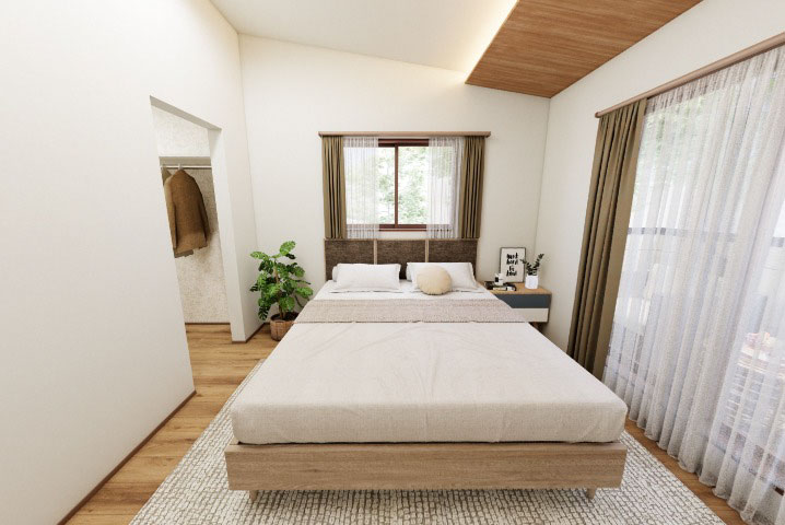 2階には、トイレ内に手洗いを設け、日常の使い勝手を高めています。さらに、共用収納を備えているため、トイレットペーパーや掃除用品などのストックもすっきり収納可能で、暮らしがより快適に。寝室は勾配天井を活かし、間接照明で高さを際立たせることで、空間に広がりとゆとりを演出しています。快適さと開放感を兼ね備えた、心地よい2階空間です。