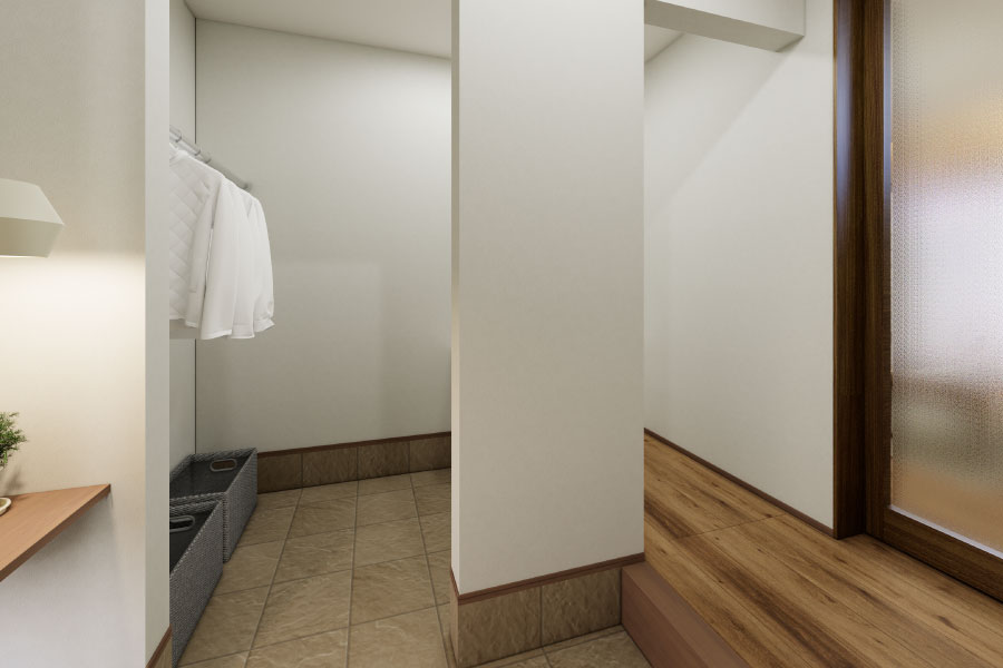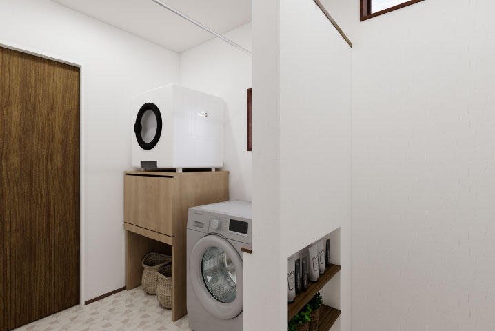 フィッティングルーム(脱衣室)とランドリールームはカーテンで仕切り湿気のこもらない空間に。また、ファミリークローゼットも併設されているため、洗う・乾かす・しまう動線が短く、キッチンからも近いため、家事効率が高まります。