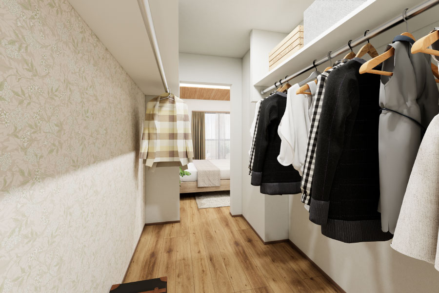 ファミリークローゼットなどの豊富な収納スペースやランドリールームを備え、考え抜かれた家事楽動線。