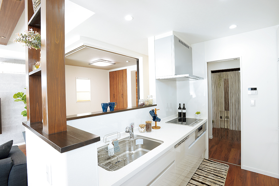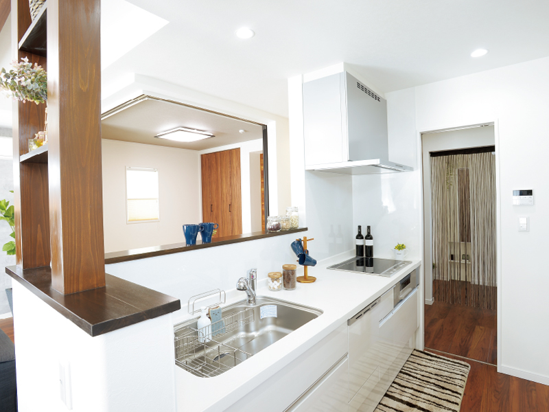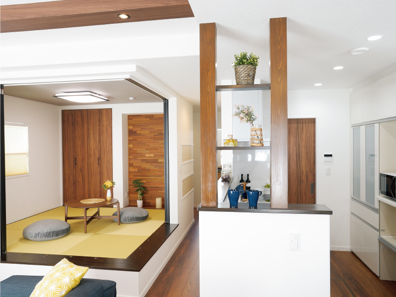 室内はシックなチーク材の風合いと、アクセントのエコカラットが程良い高級感とスタイリッシュさを演出。快適性に暮らしやすさとデザインをプラスした上質な空間です。