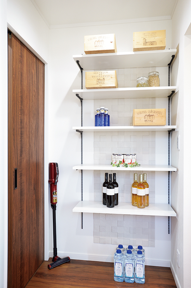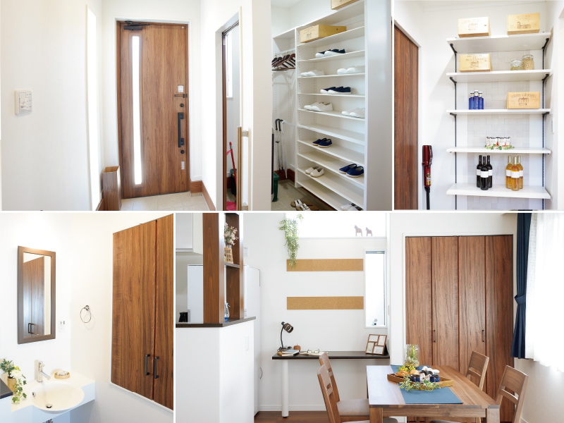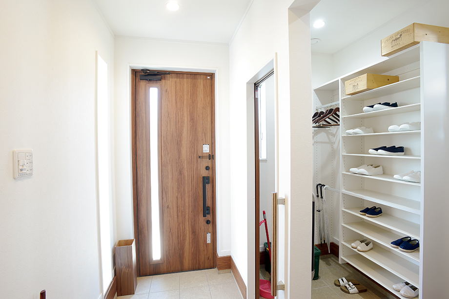玄関は家の顔。家族の靴であふれることがないように、玄関横にはたっぷり収納スペースを確保。来客時は扉を閉めて、玄関はいつもすっきりきれいな状態を保てます。また玄関横の収納スペースはキッチンへとつながるパントリーも兼ね、スットク品もたっぷり収納できます。