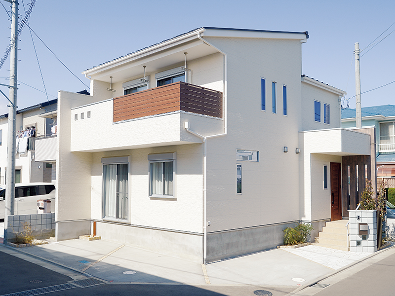 外観は白をベースに木目調でアクセントを効かせた落ち着きあるシンプルモダン。