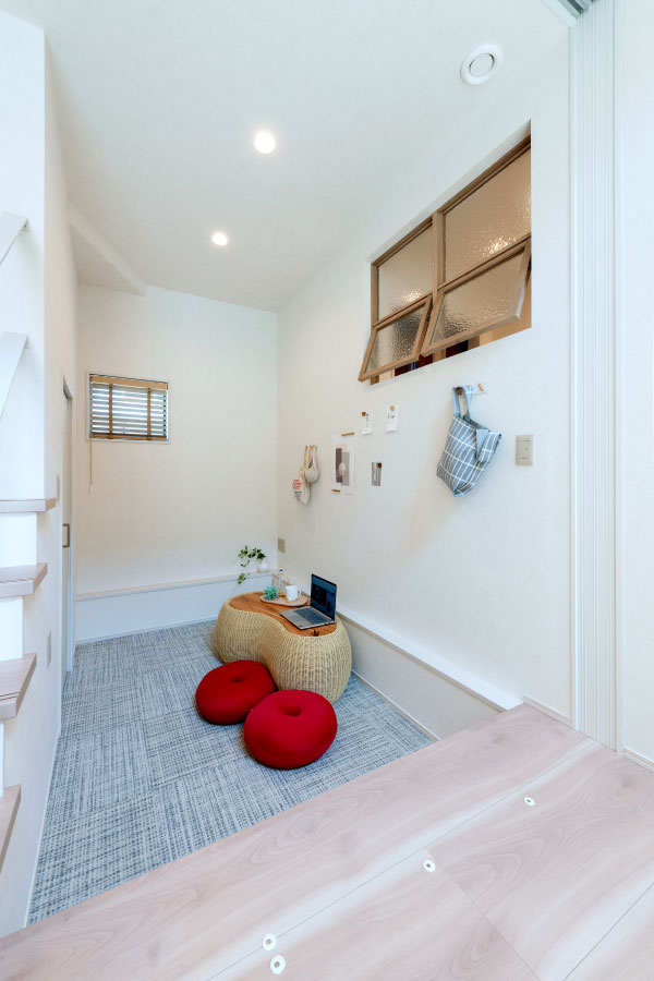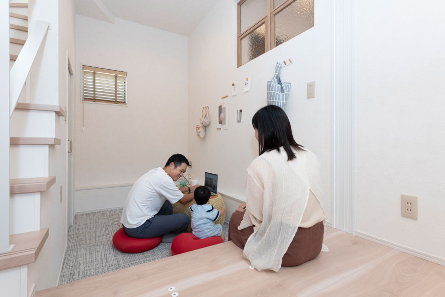 玄関は家の顔。家族の靴や物であふれることがないように、玄関横には大容量のシューズクロークを確保。玄関はいつもすっきりきれいな状態を保て、急な来客時も安心です。