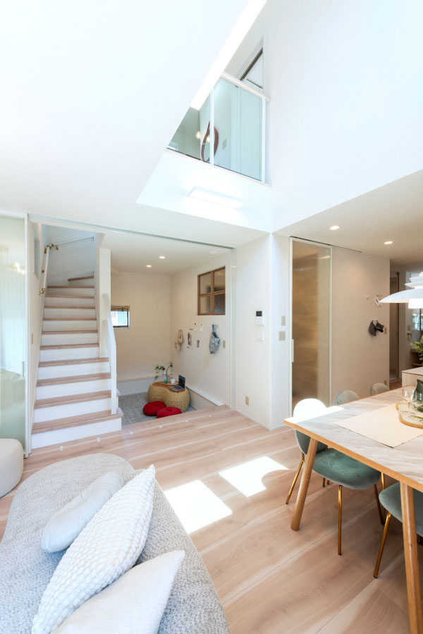吹抜けのある明るいリビングは、ウッドデッキやワークスペースなどの他の空間と繋がり、家族がどこにいてもコミュニケーションの中心に。