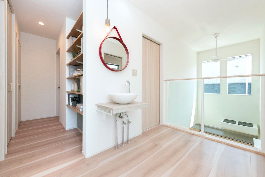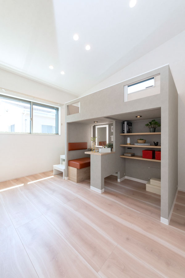 吹抜けやワークスペース、家事動線をコンパクトにまとめたキッチン横のランドリールーム、図面では表現できないIot(ネットにつないでお出掛け先からシャッターの開け閉めなど)と様々な仕掛けで共働き家族の家事楽をお助けします。