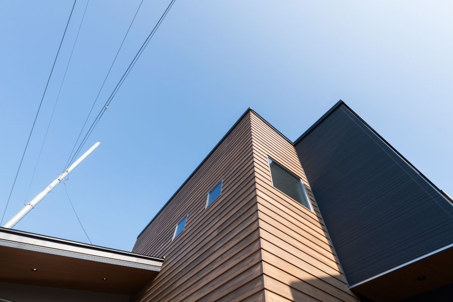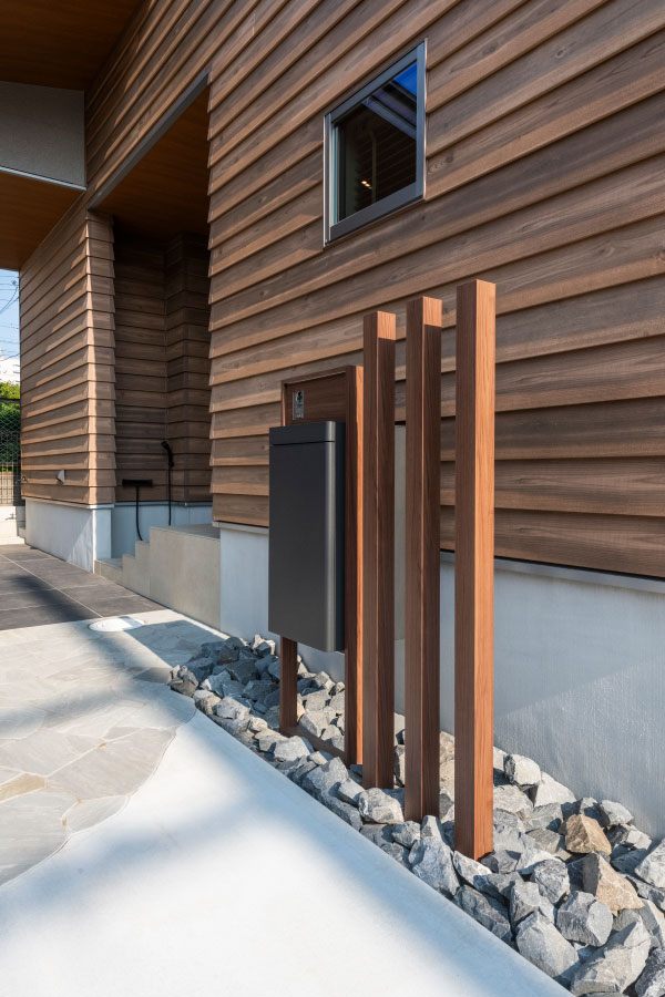 ネイビーのベースに板を重ねたまるで本物のような木目調の外壁も目を引き、雨に濡れずに乗り降りできる駐車スペース。