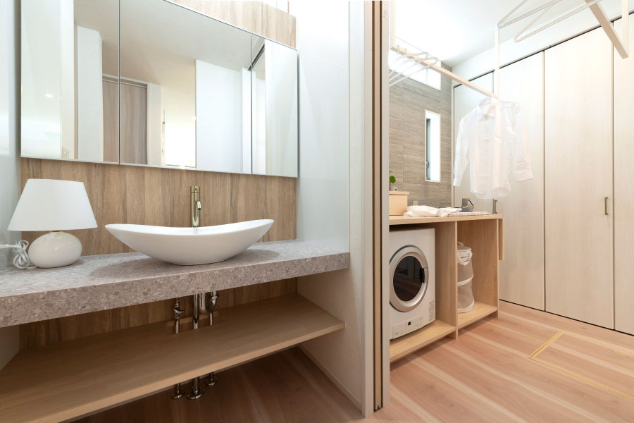 素材感や間接照明でハイクラスな空間演出と生活感は隠しつつ家事楽も追求。
