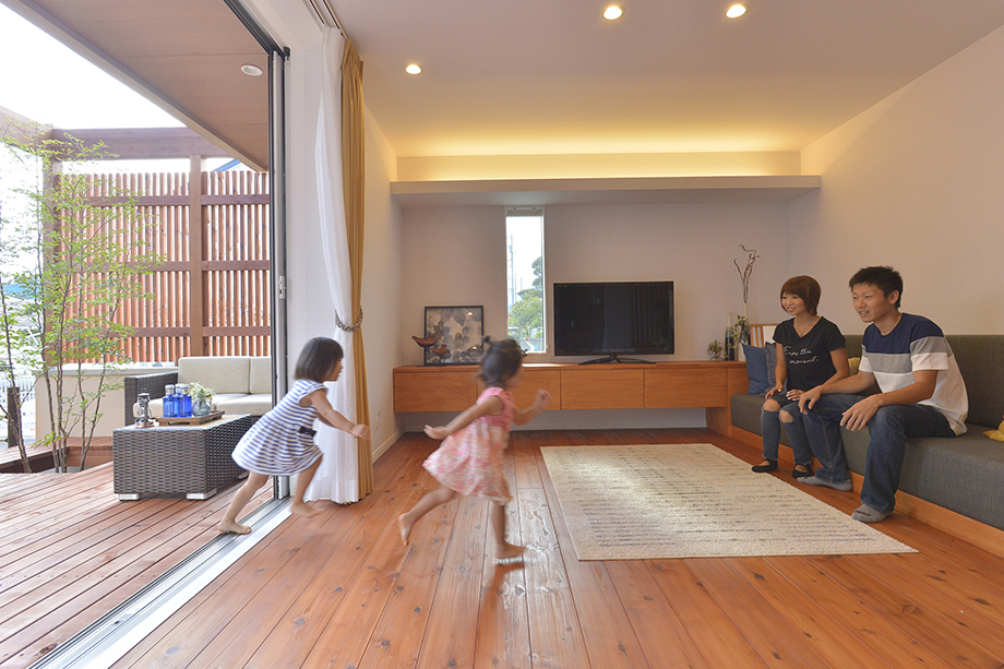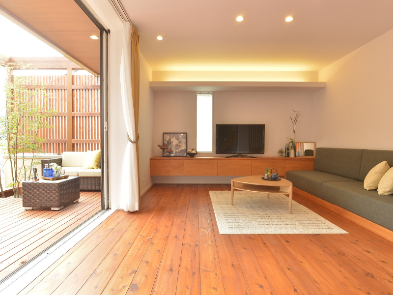 大きなウッドデッキのある中庭を楽しみながら、穏やかにくつろげるリビング。