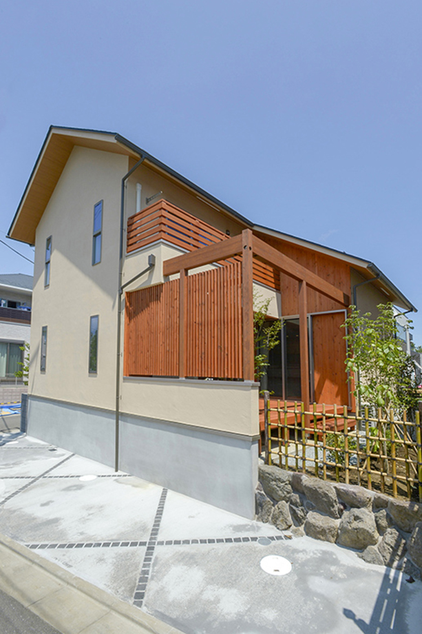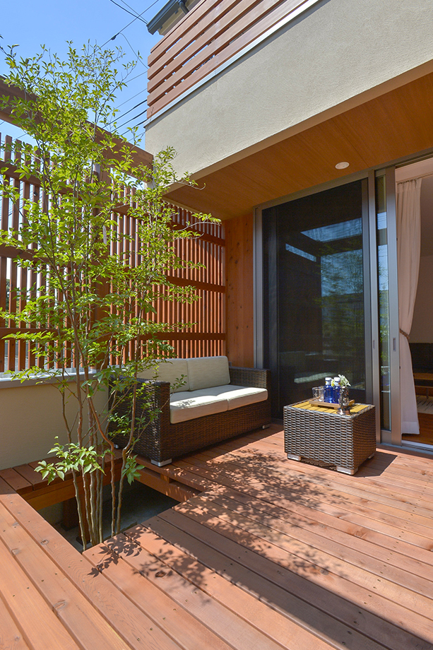 柱・梁と格子に囲われ、道路からの目線をカットしたプライベート空間。