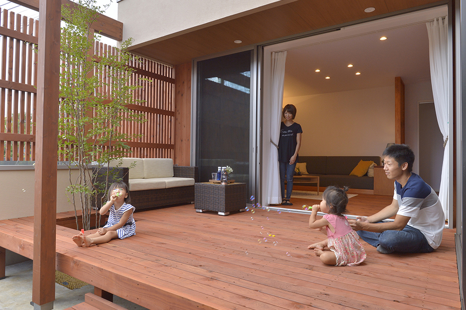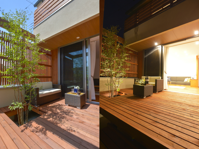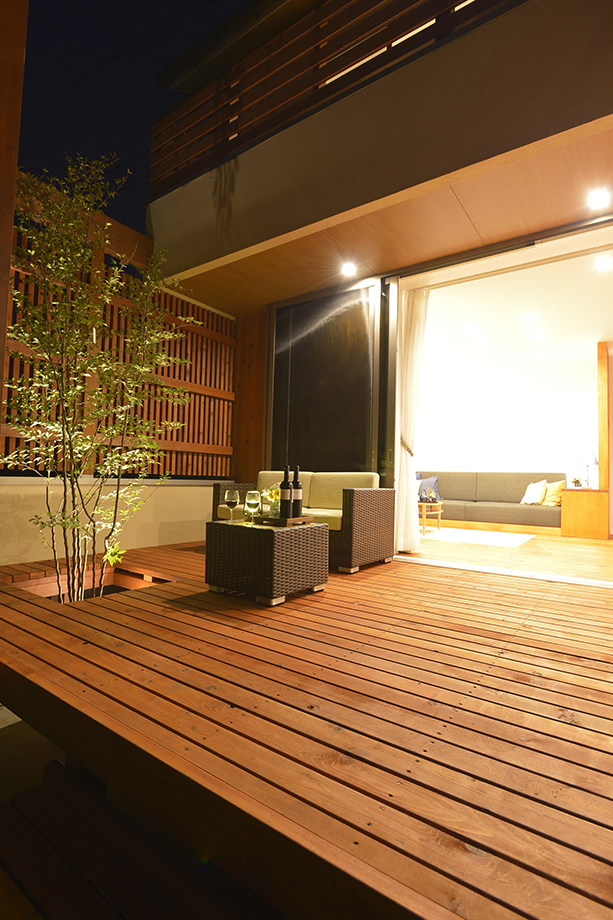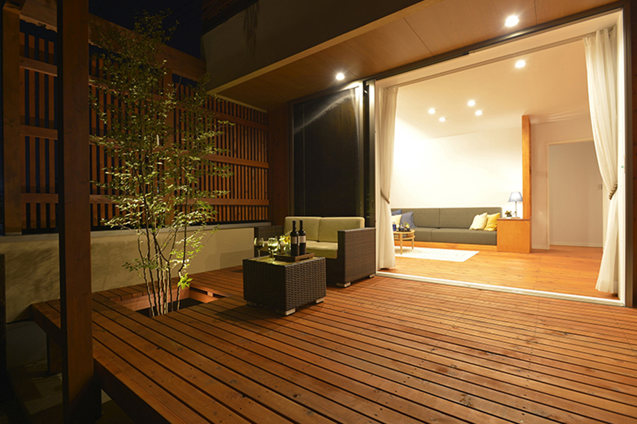 太陽の光を浴びながらランチ、友人を招いてのBBQ、夜風を感じならお酒を楽しんだり、住まわれるご家族によって様々な使い方ができるスペースです。
