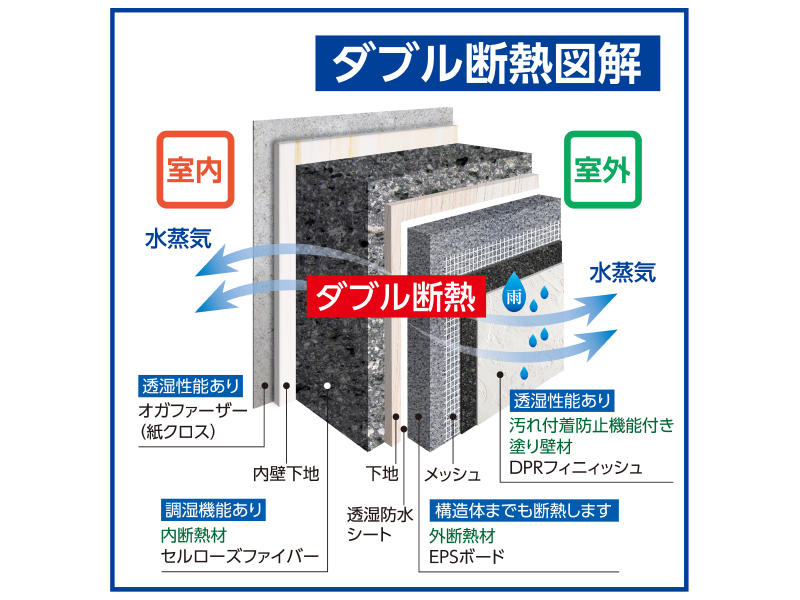 さらに柱の間に入れる内断熱ではカバーしきれない、構造まですっぽり包み込むボード系外断熱と組み合わせた、安心のダブル断熱工法です。