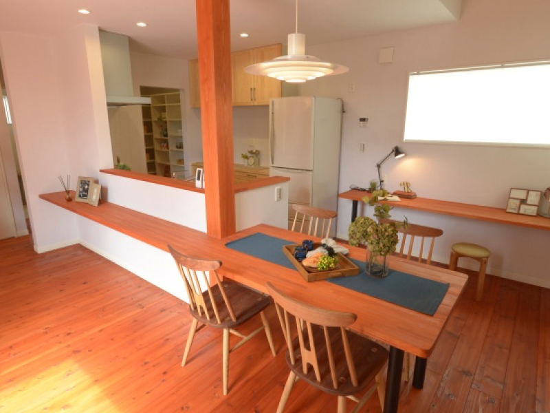 神奈川の県産材を使用し、床は無垢材、内壁には人と家に優しく調湿してくれる自然素材のオガファーザーを使用。