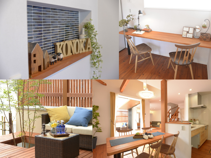 落ち着いた色合いの床と明るい木目のキッチンなどモデルハウスだからこその組み合わせ。木の香工房シリーズのテーマカラーネイビーと相性のよいマスタードでカーテンなどインテリア家具もトータルコーディネートされたワンランク上の空間づくり。
