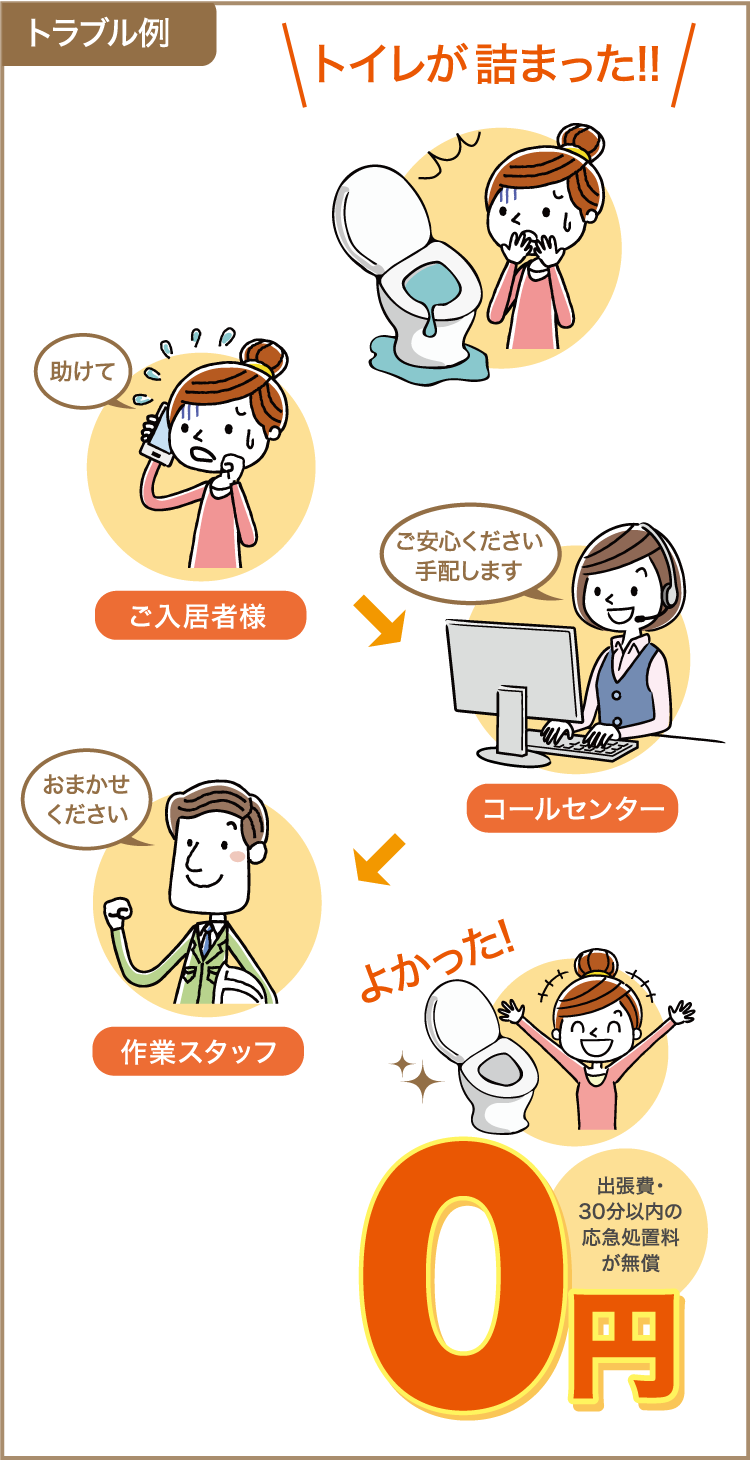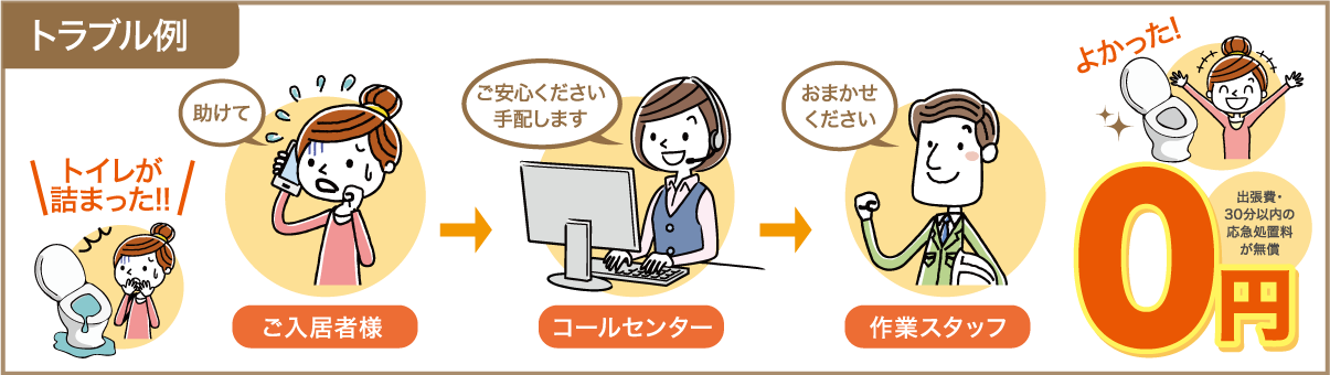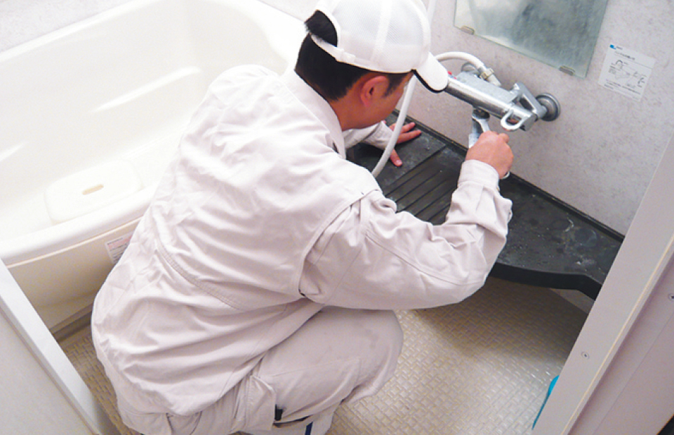 「水栓からの水漏れ」や「トイレが詰まった」など、室内での水廻りトラブルの際に、応急処置を行う作業スタッフが駆けつけます。