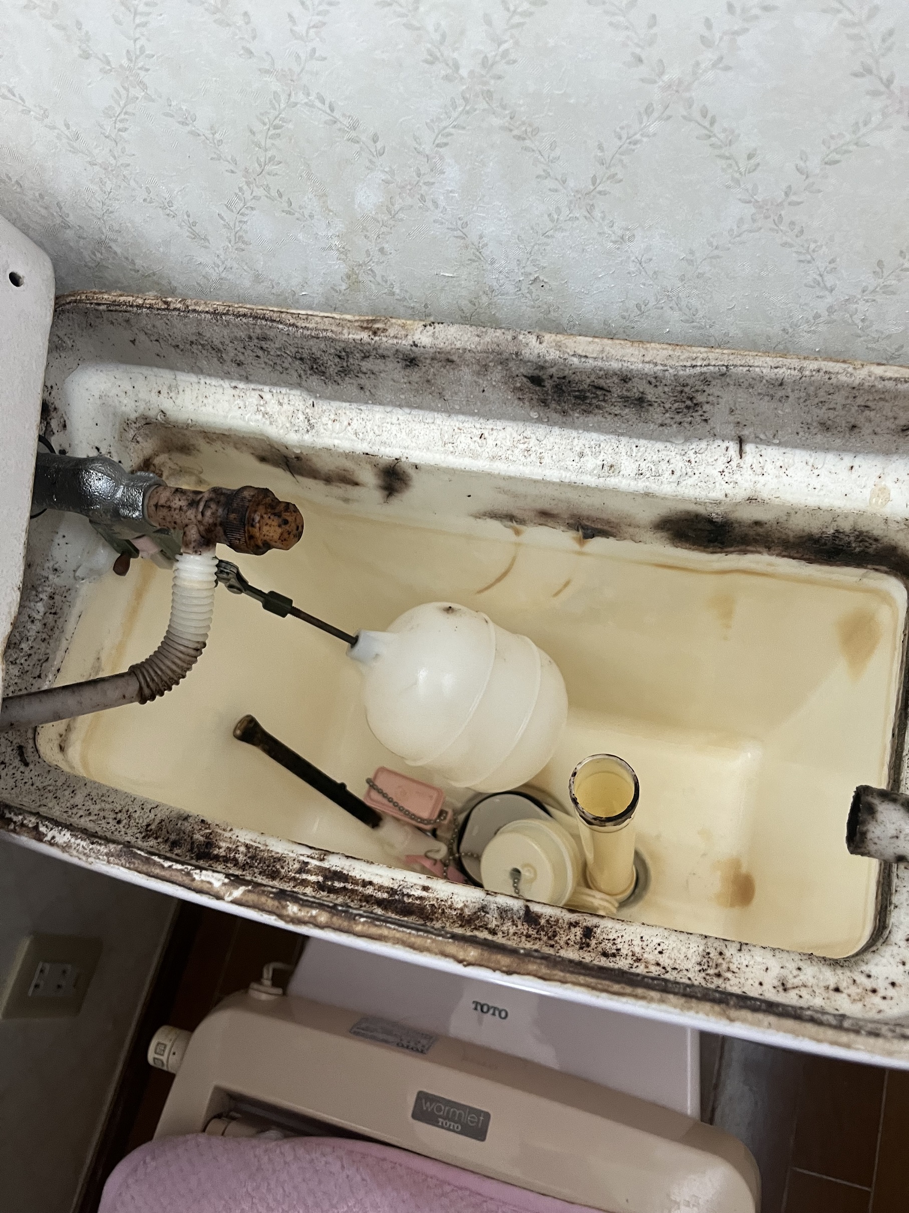 トイレの水が止まらなくなってしまったと修理のご依頼をいただきました。 トイレタンク内部のボールタップ、排水弁とレバーの取替えを行い、修理完了となりました。