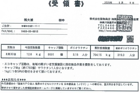 今回、63回目の回収分を「NPO法人世界の子どもにワクチンを日本委員会(JCV)」へ専用の回収業者様を介し寄与させていただきました。