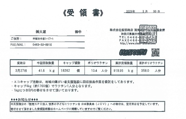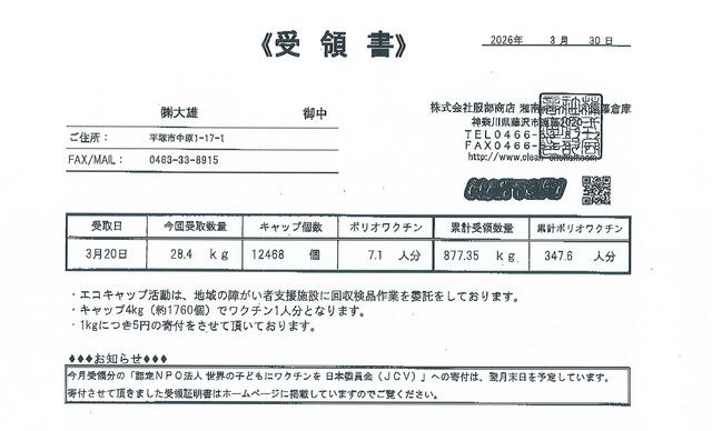 今回、68,69回目の回収分を「NPO法人世界の子どもにワクチンを日本委員会(JCV)」へ専用の回収業者様を介し寄与させていただきました。